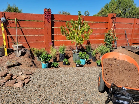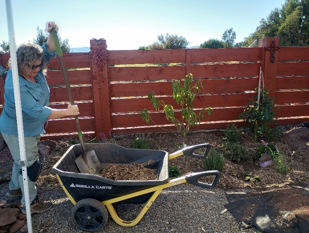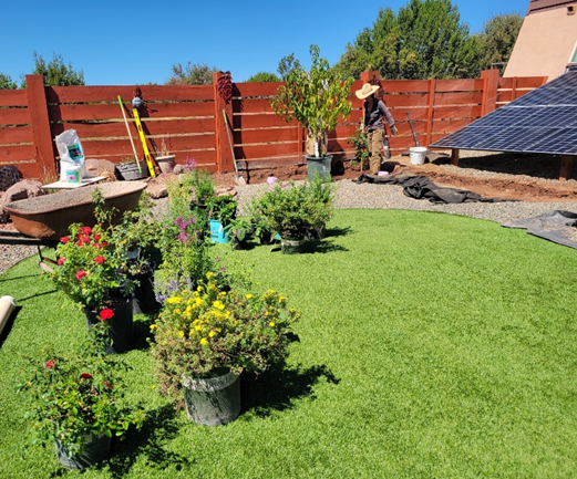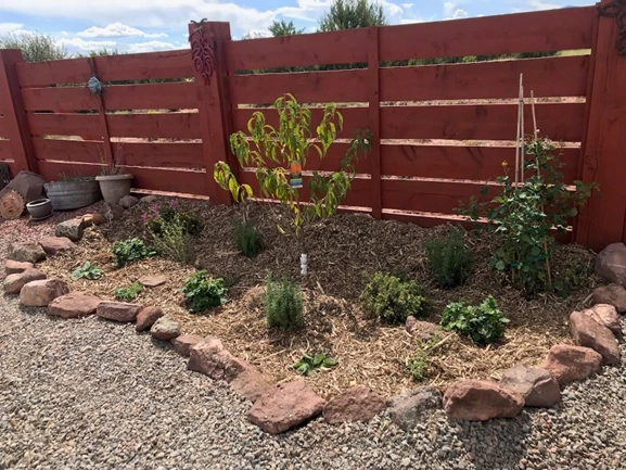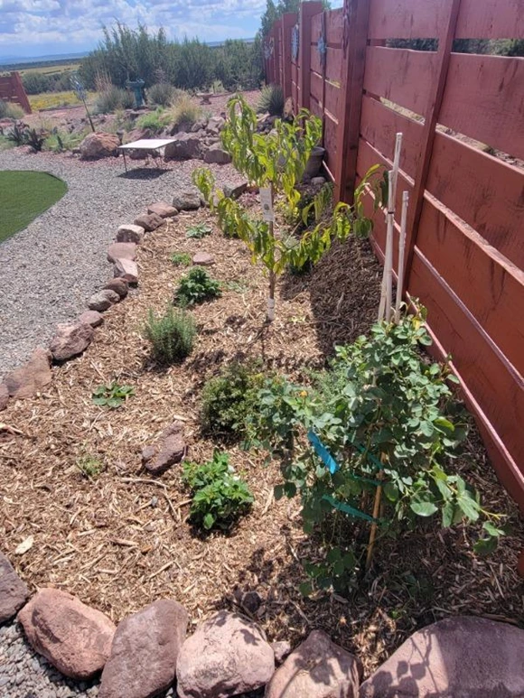 Our designers began the transformation by, first, evaluating the site’s soil health and asking her about the types of fruit trees, berries, shrubs, flowers and herbs she enjoys and would like growing in each area. We then created a landscape drawing of a fruit tree guild with plants which can be irrigated with greywater, thrive in her East Mountain microclimate, and would not cast a large or long-lasting shadow on her south facing solar array. Based on her feedback and our expertise, we selected an Alberta peach at the center surrounded by rosemary, a variety of native flowers and shrubs, a climbing rose plus thornless raspberries.