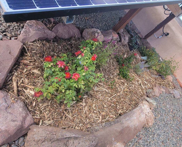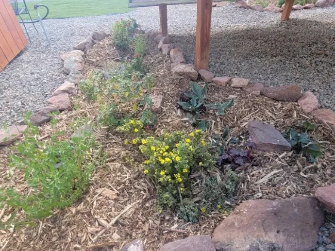 After removing about 3 cubic yards of native soil and shaping the gardens into bowls which direct water towards the center, we added nutrient dense compost, planted and then covered each garden with about 3.5 cu yards of wood mulch. Because the native soil in these garden areas had been covered with landscape cloth for decades, the soil beneath had not been exposed to sunlight or water - both essential for underground micro-organisms to create a living soil. As we dug, we encountered NO organic matter or other signs of life so we added Soil Secrets’ BIO TerraPro™ and Protein Crumblies™to the new gardens to re-awaken the Soil Food Web.